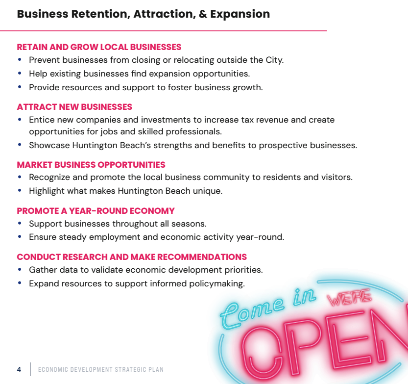 For Business Retention, Attraction, and Expansion, the strategy includes developing outreach materials, conducting regular business outreach, and hosting roundtables to support and grow the economic base. Business attraction and industry cluster strengthening will be phased, ensuring continuous engagement and regular evaluations.