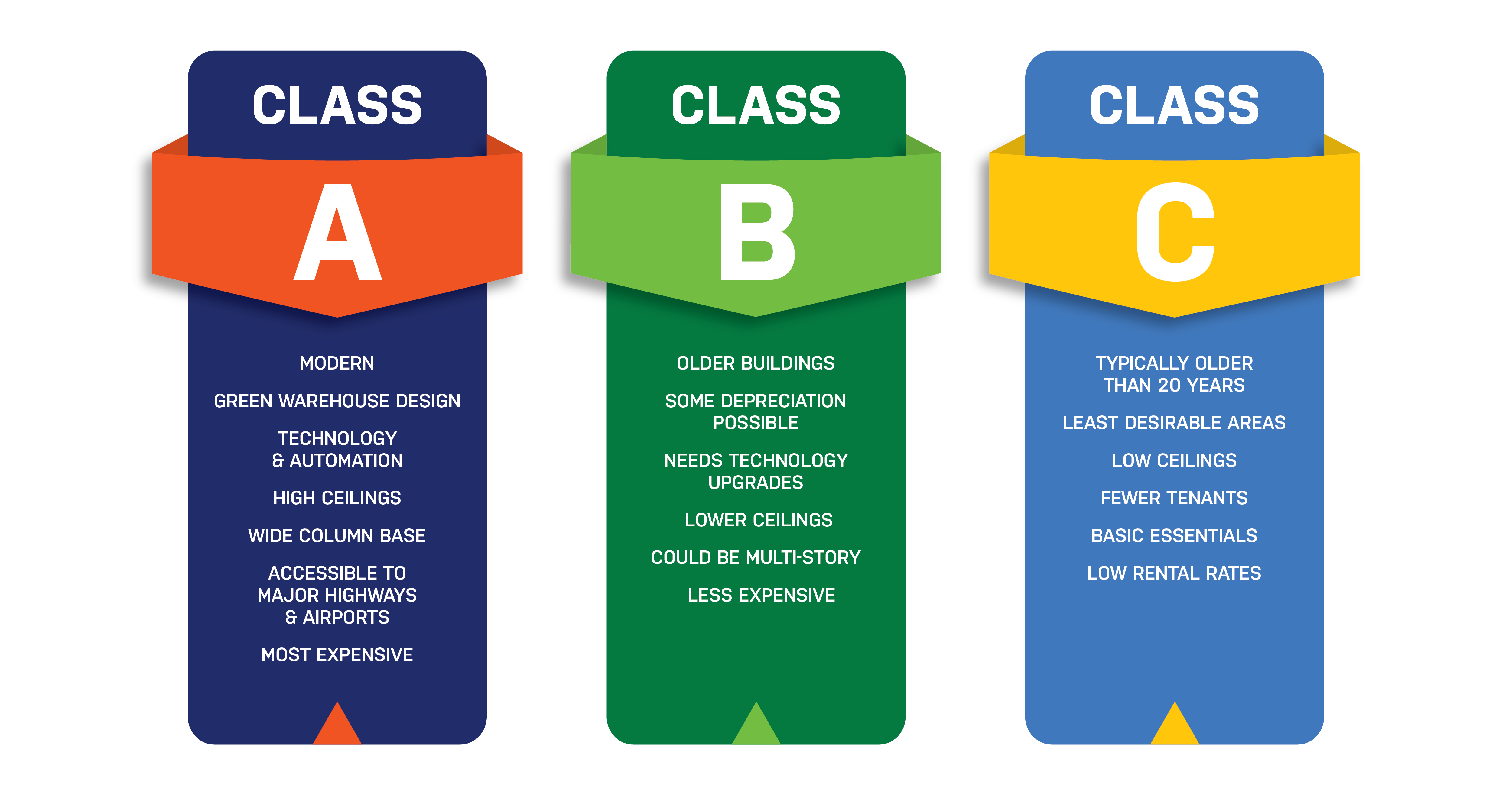 One of the ways to distinguish amongst property types, for instance, is by a property’s “class” rating. Generally speaking, properties are classified as either Class A, Class B, or Class C properties.