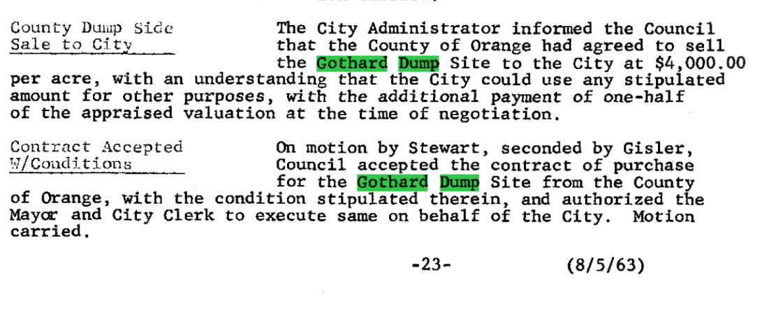 Did you know that on 8/5/1963 The County of Orange sold the Gothard Dump Site to the city for $4,000/per acre with an understanding that the city could use any stipulated amount for other purposes.