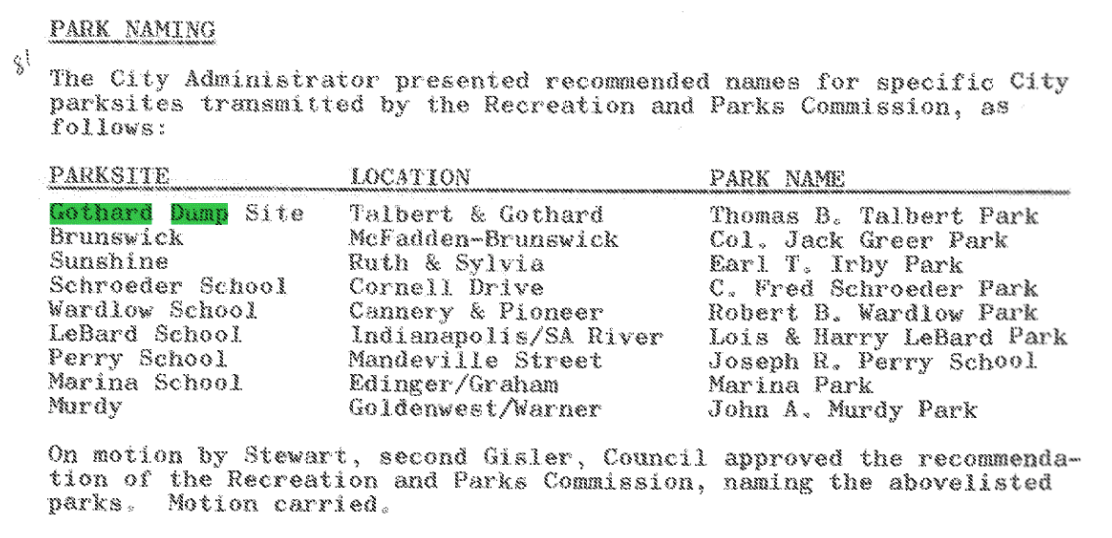 The new location was to be named the Thomas B. Talbert Park on 4/16/1966